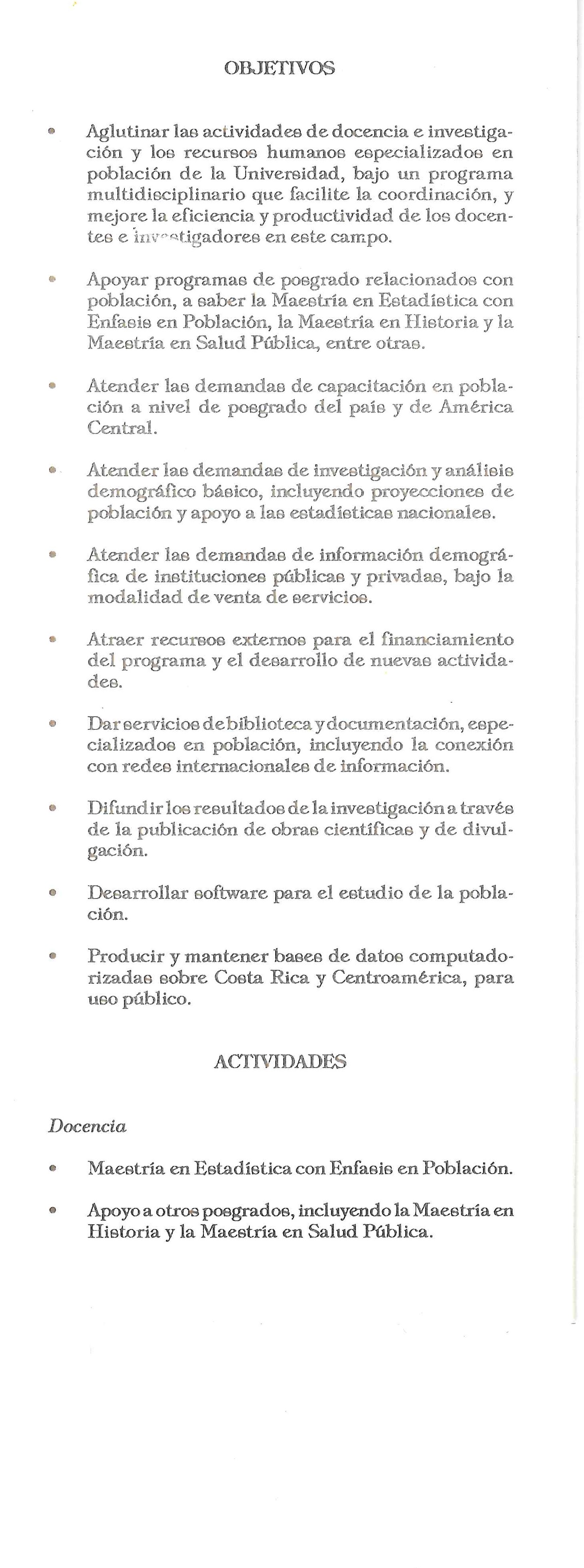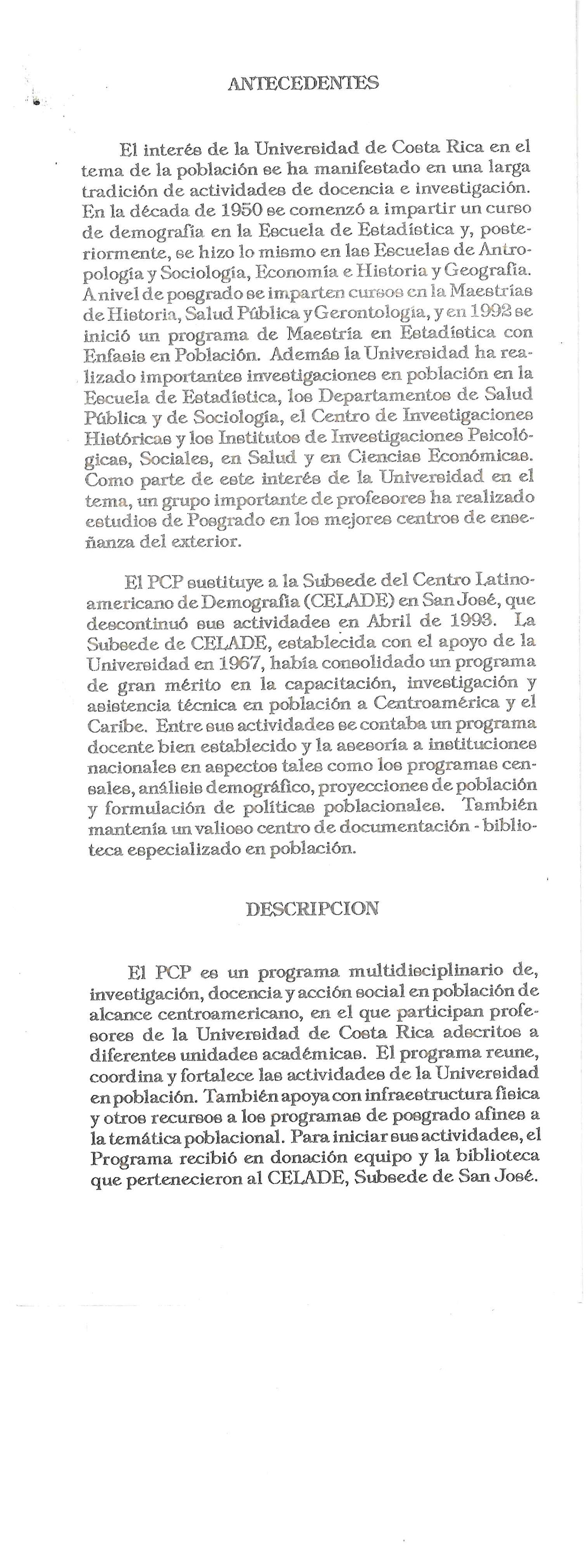 El interés de la Universidad de Costa Rica en el tema de la población se ha manifestado en un alarga tradición de actividades de docencia e investigación. En la década de 1950 se comenzó a impartir un curso demografía en la Escuela de Estadística y, posteriormente, se hizo lo mismo en las Escuela de Antropología y Sociología, Economía e Historia y Geografía. A nivel de posgrado se imparten cursos en la Maestrías de Historia, Salud Pública y Gerontología, y en 1992 se inició un programa de Maestría en Estadística con énfasis en Población. Además la Universidad ha realizado importantes investigaciones en población en la Escuela de Estadística, los Departamentos de Salud Pública y de Sociología, el Centro de Investigaciones Históricas y los Institutos de Investigaciones Psicológicas, Sociales, en Salud y en Ciencias Económicas.